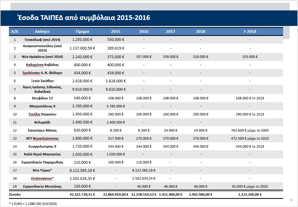 Έσοδα 42,32 εκατ. ευρώ θα εισπράξει το Ελληνικό Δημόσιο από τα 19 ακίνητα, τα οποία αξιοποιούνται ήδη από το ΤΑΙΠΕΔ, εκ των οποίων τα 12,15 εκατ. ευρώ θα ενισχύσουν φέτος τα δημόσια ταμεία.Σύμφωνα με τον πίνακα που παρουσιάζει το ΑΠΕ-ΜΠΕ, τα ακίνητα αφορούν τόσο σε εκτάσεις όσο και σε ακίνητα του εσωτερικού αλλά και του εξωτερικού και τα έσοδα έχουν αρχίσει να εισπράττονται από το 2014 και κάποια φτάνουν σε βάθος χρόνου μέχρι το 2019 και για μια περίπτωση μέχρι το 2065.