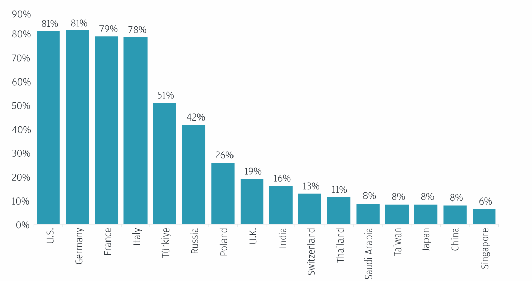 Στο γράφημα που ακολουθεί παρουσιάζονται οι χώρες που κατέχουν τα μεγαλύτερα ποσοστά αποθεμάτων χρυσού στα συνολικά αποθεματικά διαθεσίμων επιλεγμένων κεντρικών τραπεζών παγκοσμίως: