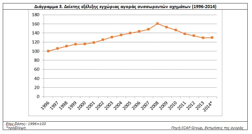 Περαιτέρω, οι νέες καταχωρήσεις αυτοκινήτων γενικά στην Ελλάδα κατέγραψαν ραγδαία πτώση. Η φθίνουσα πορεία της αγοράς άρχισε από το 2008 και συνεχίστηκε για 6 έτη. Ιδιαίτερα στην κατηγορία των νέων επιβατικών αυτοκινήτων (που αποτελούν τη συντριπτική πλειοψηφία), οι νέες καταχωρήσεις κατέγραψαν μεγάλα ποσοστά μείωσης μέχρι το 2012, ενώ σημειώθηκε στασιμότητα το 2013, στα πολύ χαμηλά επίπεδα που έχει διαμορφωθεί πλέον η αγορά (58.694 οχήματα). Η πτωτική πορεία ανακόπηκε το 2014, οπότε οι νέες καταχωρήσεις επιβατικών αυτοκινήτων εμφάνισαν σημαντική ετήσια αύξηση.