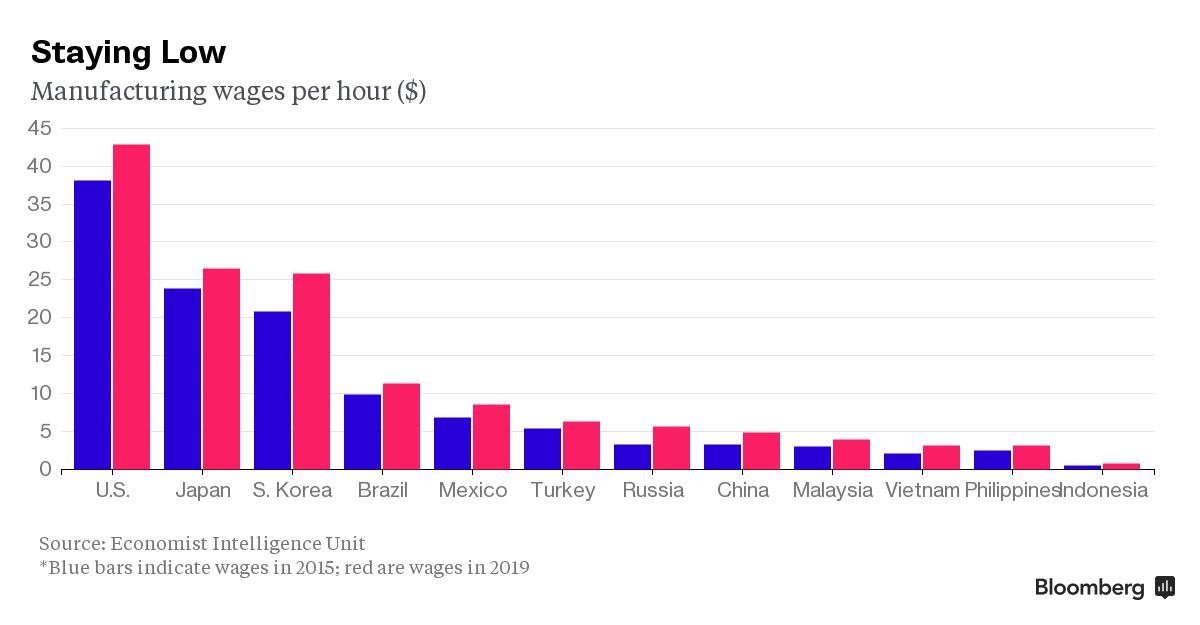 Τα ωρομίσθια στις ΗΠΑ θα αυξηθούν κατά 12% στα 42,82 δολάρια μέχρι το 2019, ενώ στην Ινδονησία κατά 48% -αν και σε χρήμα θα ανέρχονται σε μόλις 74 σεντς την ώρα, ποσό ακόμα χαμηλότερο και από αυτά που παίρνουν οι εργαζόμενοι στην Κίνα (4,79 δολάρια), στο Βιετνάμ (3,16 δολάρια) και στις Φιλιππίνες (3,15 δολάρια).