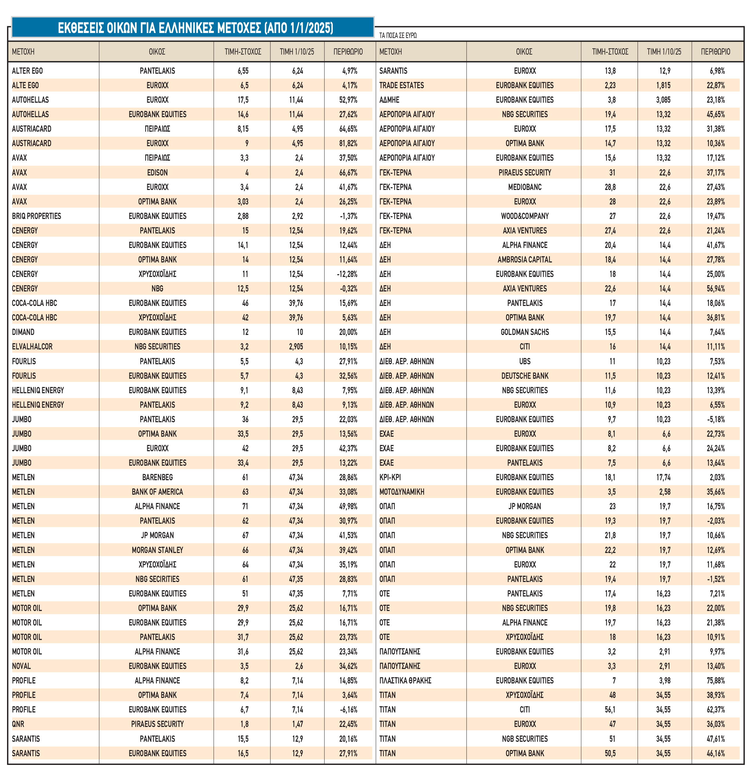 Στον παρατιθέμενο πίνακα εμφανίζονται οι τιμές-στόχοι που έχουν δημοσιεύσει μέσα στο 2025 ελληνικοί και ξένοι οίκοι για μη τραπεζικές εισηγμένες μετοχές του ελληνικού χρηματιστηρίου. Αξιοσημείωτο είναι ότι οι πλέον πρόσφατες εκθέσεις βρίσκονται σε υψηλότερη θέση στον πίνακα, οπότε ένα γενικότερο συμπέρασμα είναι πως με την πάροδο των μηνών μέσα στο 2025, οι τιμές-στόχοι ακολούθησαν ανοδική πορεία επηρεασμένες από οικονομικά αποτελέσματα, εξαγορές και άλλες εξελίξεις που αφορούσαν την ελληνική οικονομία και τις ίδιες τις εταιρείες.