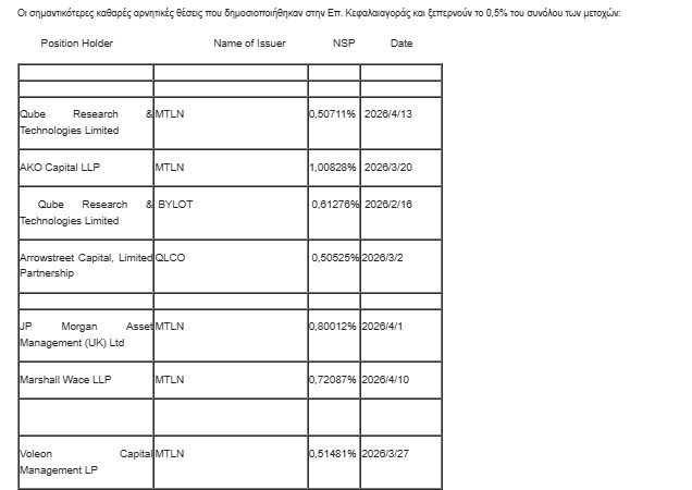 Επίσης, η Qube Research & Technologies Limited εμφανίζεται με αρνητική καθαρή θέση 0,50711%, που άνοιξε στις 13/4, στη μετοχή της MTLN.