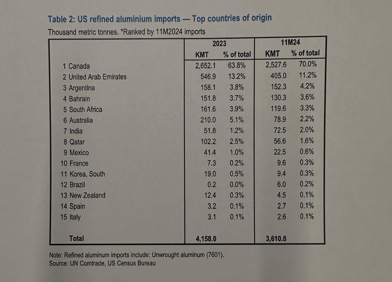 Όπως προκύπτει από τα στοιχεία της JP Morgan, τους 11 μήνες του 2024 οι εξαγωγές επεξεργασμένου αλουμινίου του Καναδά προς τις ΗΠΑ έφτασαν τους 2,527 εκατ. μετρικούς τόνους ή στο 70% του συνόλου.