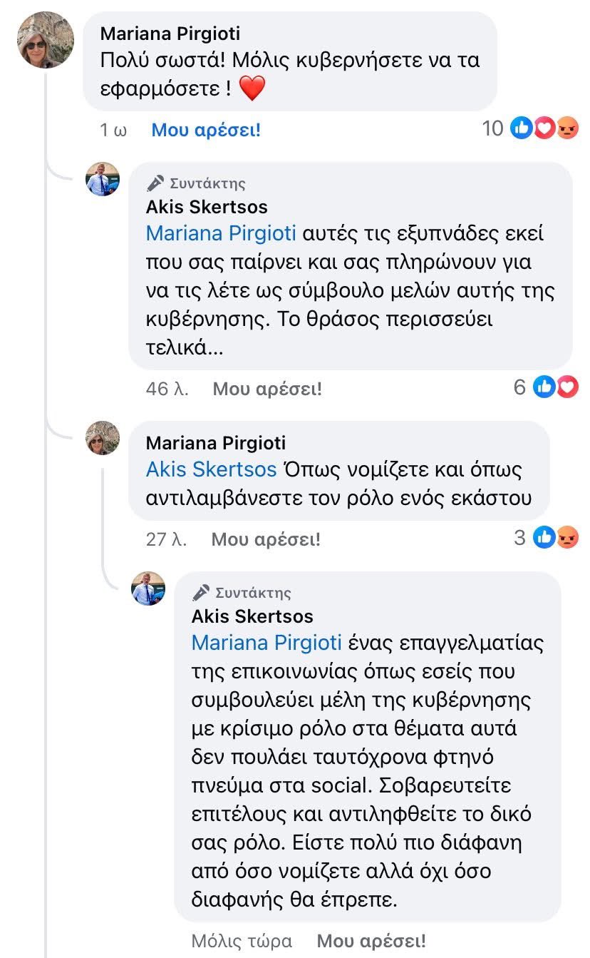 Ο μάλλον απρεπής τόνος (απέναντι σε μια κυρία), αλλά και η απαξιωτική παρατήρηση «τις εξυπνάδες εκεί που σας παίρνει και σας πληρώνουν για να τις λέτε, ως σύμβουλος μελών αυτής της κυβέρνησης» φαίνεται να είχε κι άλλους αποδέκτες, πλην της Μαριάννας. Εν προκειμένω, τον υπουργό Ναυτιλίας Βασίλη Κικίλια, τον οποίο φέρεται να συμβουλεύει η τελευταία.