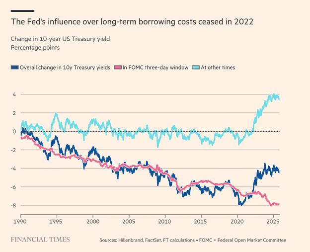 Στο πλαίσιο αυτό, βρήκαμε κι ένα γράφημα των Financial Times που δείχνει ότι από το 2022 οι μειώσεις επιτοκίων από τη Fed έχουν σταματήσει να επιδρούν στα μακροχρόνια επιτόκια κρατικού δανεισμού των ΗΠΑ: