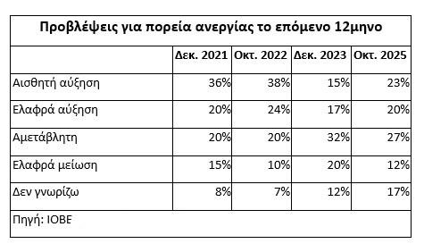 Μια άλλη ένδειξη για το πώς αντιλαμβάνονται τα πράγματα τα ελληνικά νοικοκυριά προκύπτει από τις μηνιαίες Έρευνες Οικονομικής Συγκυρίας που εκπονεί ο ΙΟΒΕ. Στην τελευταία (Οκτώβριος 2025), το 43% των ερωτηθέντων προβλέπει αύξηση της ανεργίας το επόμενο 12μηνο και μόλις το 12% ελαφρά μείωση.