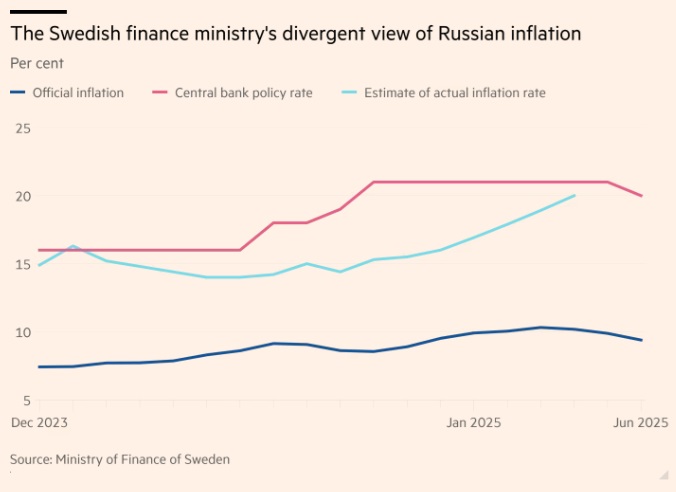 Αυτό δεν μπορεί να είναι απίθανο. Η Ρωσία δεν έχει καταφέρει να κερδίσει μέχρι στιγμής, παρότι έχει έναν πληθυσμό σχεδόν τετραπλάσιο αυτού της Ουκρανίας και ένα ΑΕΠ (σε ισοτιμία αγοραστικής δύναμης) υπερδεκαπλάσιο. Υπάρχουν επίσης κάποιοι λόγοι να πιστεύουμε πως η ρωσική οικονομία είναι πιο πιεσμένη από αυτό που παραδέχονται οι αρχές. Το σουηδικό υπουργείο Οικονομικών μού λέει πως νομίζουν ότι τα στοιχεία της ρωσικής κυβέρνησης για τον πληθωρισμό είναι πολύ υψηλότερα από αυτά που δημοσιοποιούν. Αυτό μπορεί να εξηγήσει γιατί το επιτόκιο πολιτικής της κεντρικής τράπεζας είναι 20% ενώ ο πληθωρισμός είναι επισήμως σχεδόν 10%.