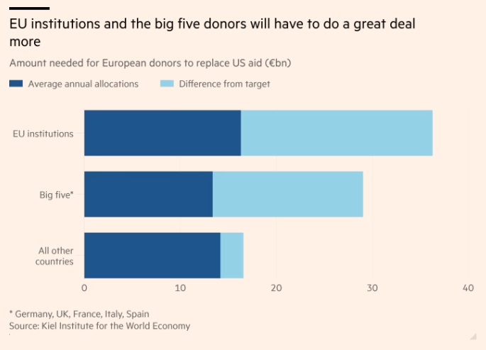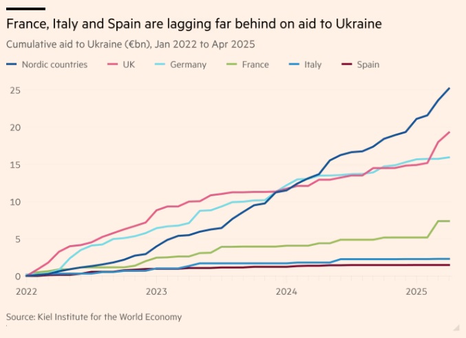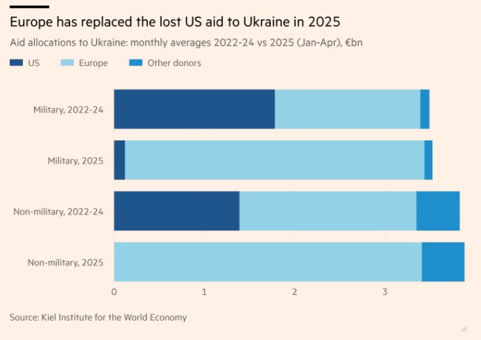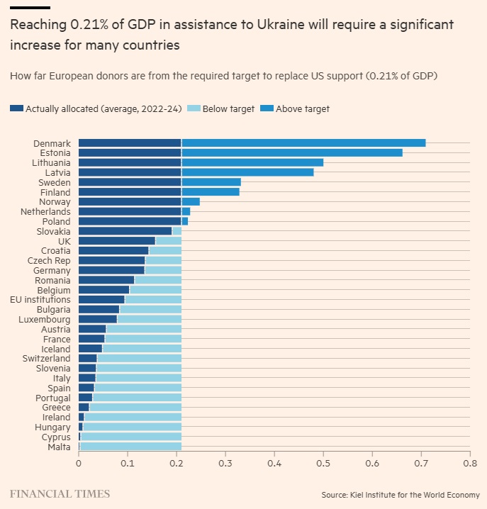 Μέχρι φέτος, οι Ευρωπαίοι (ΕΕ συν ΗΒ) έδωσαν παρόμοια ποσά με αυτά των ΗΠΑ. Εκτοτε, οι ΗΠΑ έχουν σταματήσει να παρέχουν κεφάλαια, υποστηρίζοντας ότι θα πρέπει να πληρώσουν οι Ευρωπαίοι. Βραχυπρόθεσμα, λίγες μόνο χώρες κάλυψαν αυτό το κενό. Αλλά αυτό πρέπει να τακτοποιηθεί. Μέχρι τώρα, οι ευρωπαϊκές κυβερνήσεις δαπανούν μόλις το 0,1% του ετήσιου ΑΕΠ σε διμερή βοήθεια προς την Ουκρανία. Το λιγότερο, θα πρέπει να το διπλασιάσουν αυτό αμέσως. Αυτό και πάλι θα ήταν λιγότερο από το ήμισυ αυτού που κάνουν η Δανία και οι χώρες της Βαλτικής και περίπου το ίδιο με την Πολωνία και την Ολλανδία.