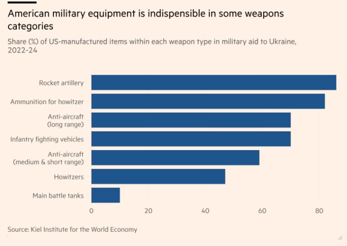 Ο αμερικανικός στρατιωτικός, ιδιαίτερα επιθετικός εξοπλισμός είναι επίσης ζωτικής σημασίας. Οι Ευρωπαίοι θα πρέπει να παράγουν περισσότερα οι ίδιοι, να χρηματοδοτήσουν την παραγωγή της Ουκρανίας και να αγοράσουν απευθείας από τις ΗΠΑ. Η πρόσφατη ρήξη του Ντόναλντ Τραμπ με τον Πούτιν μπορεί να βοηθήσει εδώ.