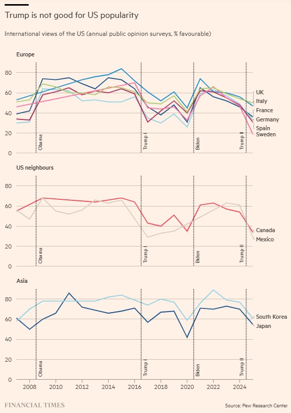 Επιπλέον, ο Τραμπ πιστεύει ότι οι σύμμαχοι μπορούν να μετατραπούν σε υποτελείς. Αυτό δεν είναι ασύμβατο με τη συμπεριφορά τους. Το Ηνωμένο Βασίλειο επέλεξε να γίνει υποτελής. Αυτό, κατά ειρωνικό τρόπο, είναι συνέπεια της αναζήτησης ενισχυμένης εθνικής κυριαρχίας από το Brexit. Ωστόσο, η Ιαπωνία, η Νότια Κορέα και ακόμη και η ΕΕ δεν φαίνονται και τόσο διαφορετικές, μέχρι στιγμής.