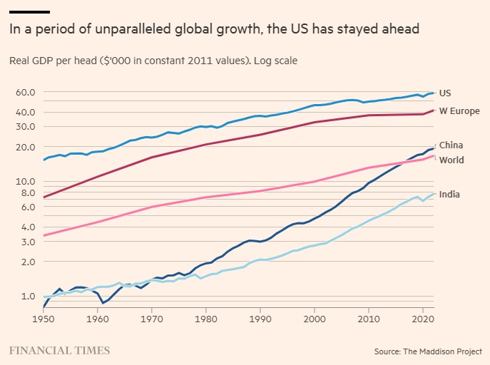 Ο Τραμπ γκρινιάζει πως έχουν «καταληστέψει» τις ΗΠΑ. Το γεγονός, ωστόσο, είναι πως παρέμεινε η πλουσιότερη και πιο τεχνολογικά προηγμένη οικονομία του κόσμου σε μια περίοδο απαράμιλλής παγκόσμιας ανάπτυξης: από το 1950 μέχρι το 2020 το μέσο παγκόσμιο κατά κεφαλήν πραγματικό ΑΕΠ αυξήθηκε κατά 360%!