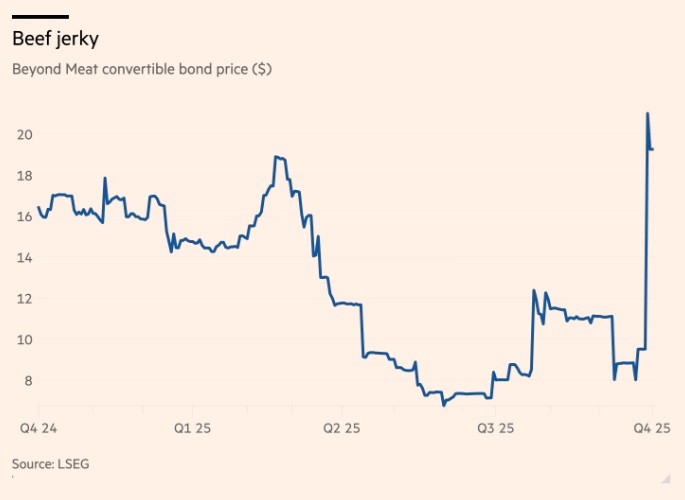 Η ανοησία αυτής της «ευκαιρίας» έγινε σαφής αυτήν την εβδομάδα. Η Beyond Market, η εταιρεία εναλλακτικής πρωτεΐνης που κάποτε «πέταγε», εξέδωσε μετατρέψιμα ομόλογα μηδενικού τοκομεριδίου που θα μπορούσαν να ανταλλαχθούν με μετοχές στην περίπτωση που η τιμή έπιανε τα 206 δολάρια.