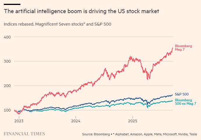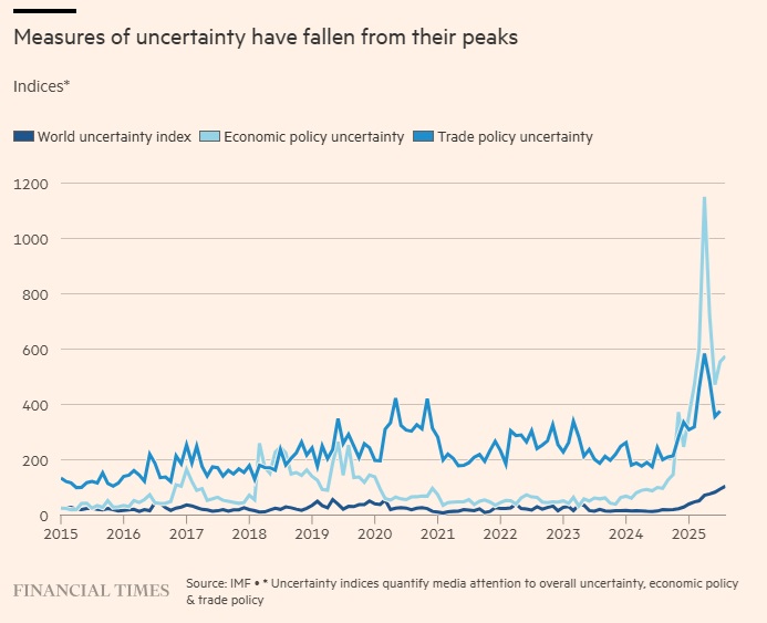 Τρίτον, τα χρηματιστήρια συνέχισαν να είναι ζωηρά και οι χρηματοπιστωτικές συνθήκες να παραμένουν ευρύτερα υποστηρικτικές. Αυτό οφείλεται εν μέρει, ιδιαίτερα στις ΗΠΑ, στην επενδυτική έκρηξη στην τεχνητή νοημοσύνη. Το αν αυτό βασίζεται στην πραγματικότητα ή είναι το είδος της φούσκας που τόσο συχνά συνοδεύει τέτοιες καινοτομίες, παραμένει άγνωστο.