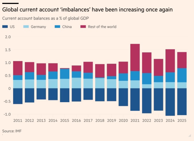 Σημειώνει, για παράδειγμα, πως ο δείκτης δημοσιονομικού ισοζυγίου της γενικής κυβέρνησης των ΗΠΑ σε σχέση με το ΑΕΠ αναμένεται να επιδεινωθεί κατά 0,5 ποσοστιαίες μονάδες το 2026, κυρίως λόγω της «ψήφισης του νόμου One Big Beautiful Bill Act (OBBBA) και παρά την αντιστάθμιση περίπου 0,7 ποσοστιαίων μονάδων του ΑΕΠ από τα προβλεπόμενα έσοδα από δασμούς». Αυτό, επίσης, καθιστά μάλλον απίθανο να υπάρξουν μεγάλες μειώσεις στις παγκόσμιες ανισορροπίες των τρεχουσών συναλλαγών, αν και το ΔΝΤ προβλέπει μέτριες μειώσεις.