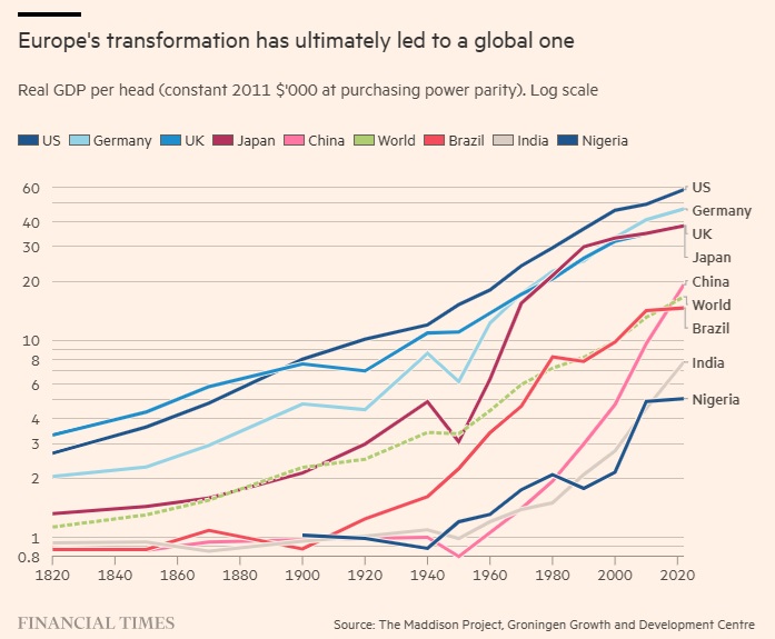 Τον 19 και τον 20 αιώνα, οι οικονομίες της δυτικής Ευρώπης αυξήθηκαν δραματικά: το 2022 το πραγματικό κατά κεφαλήν ΑΕΠ της δυτικής Ευρώπης ήταν 19 φορές αυτό που ήταν προ 200 ετών. Το προσδόκιμο ζωής επίσης αυξήθηκε, από τα 36 έτη το 1820 στα 82 το 2020.