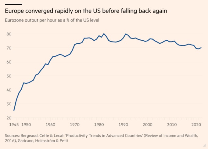 Σε όρους ισοτιμίας αγοραστικής δύναμης, η οικονομία της είναι μικρότερη από αυτές των ΗΠΑ και της Κίνας, αλλά και πάλι είναι πολύ μεγάλη. Αλλά, όπως σημειώθηκε στην έκθεση Ντράγκι και επίσης στο «The Constitution of Innovation», μια πρόσφατη εργασία των Luis Garicano, Bengt Holmström και Nicolas Petit, η ΕΕ και η ευρωζώνη υστερούν στην παραγωγικότητα. Δυσκολεύεται επίσης να κινητοποιήσει τους οικονομικούς και δημογραφικούς πόρους της, που είναι πολύ μεγαλύτεροι από αυτούς της Ρωσίας, προκειμένου να εγγυηθεί την ίδια της την ασφάλεια χωρίς την προστασία της αμυντικής ομπρέλας των ΗΠΑ.