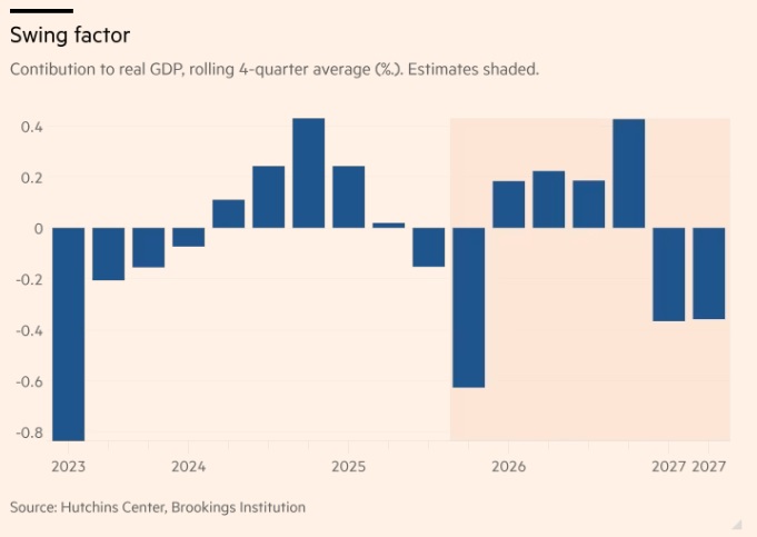 Η δημοσιονομική ώθηση στις ΗΠΑ, που ήταν αρνητική το δεύτερο ήμισυ αυτού του έτους (και όχι μόνον λόγω του shutdown) πρόκειται να γίνει θετική του χρόνου. Ακολουθούν οι εκτιμήσεις του Brookings Institution για τριμηνιαία ώθηση της ανάπτυξης του πραγματικού ΑΕΠ ανά τρίμηνο. Για να το θέσουμε πιο ξεκάθαρα, η Principal Asset Management εκτιμά πως το μέσο νοικοκυριό θα λάβει επιπλέον 700 δολάρια στην επιστροφή φόρου στο πλαίσιο του «μεγάλου, όμορφου νομοσχεδίου» ενώ τα επενδυτικά κίνητρα στο νομοσχέδιο μπορεί να οδηγήσουν σε μείωση του πραγματικού συντελεστή εταιρικού φόρου από το 21% έως το 16%.
