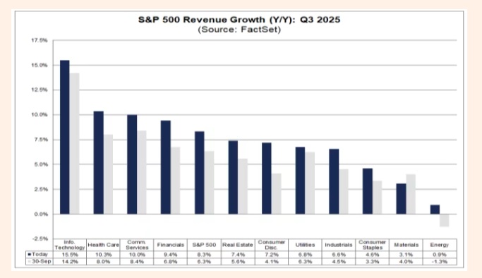 -Τα κέρδη των μεγάλων εταιρειών τα πάνε καλά: Τα έσοδα του S&P 500 αυξήθηκαν ταχύτερα από τον πληθωρισμό το γ’ τρίμηνο και τα περιθώρια διευρύνονται. Και όχι, οι Magnificent 7 δεν κάνουν όλη τη δουλειά. Αναλογιστείτε αυτό το διάγραμμα της FactSet, ή την ανάπτυξη των εσόδων ανά τομέα: