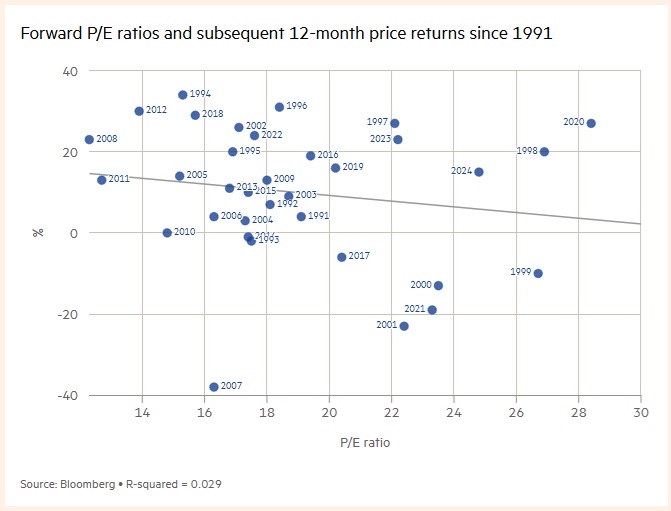 Το παρακάτω διάγραμμα παρέχει μια τσαπατσούλικη εικόνα αυτής της επισήμανσης. Δείχνει τους μελλοντικούς δείκτες τιμής/κερδών του S&P 500 στο τέλος κάθε έτους από το 1991 και μετά, σε σύγκριση με τις αποδόσεις των τιμών για το επόμενο έτος (έτσι, η κουκκίδα με την ένδειξη «1994» δείχνει τον δείκτη P/E στο τέλος του 1994, που ήταν 15,3, και την απόδοση των τιμών το 1995, που ήταν 34%). Ο δείκτης r-squared της σχέσης μεταξύ αποτίμησης και απόδοσης, που είναι μικρότερος από 3%, δείχνει ότι οι δύο παράμετροι έχουν ελάχιστη σχέση μεταξύ τους: