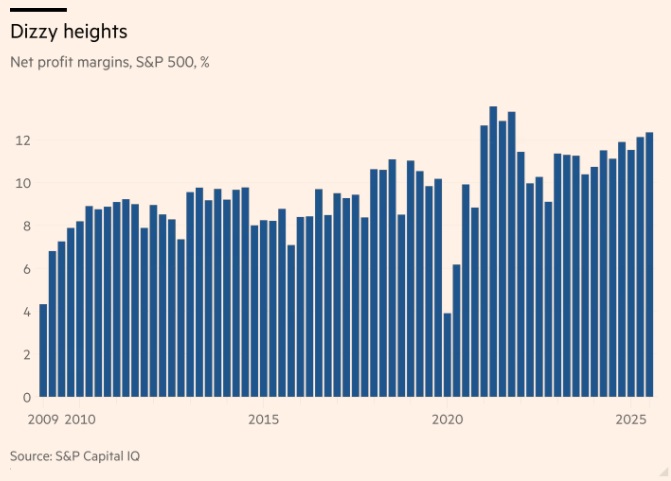Τα περιθώρια κέρδους ήταν αρκετά υψηλά πρόσφατα (βλ. παρακάτω διάγραμμα των περιθωρίων κέρδους του S&P 500, ως παράδειγμα). Αυτό που με ανησυχεί είναι η αποδυνάμωση των καταναλωτών, η σωρευτική επίδραση των δασμών που περιορίζουν τα περιθώρια κέρδους και η αύξηση των εξόδων απόσβεσης στις μεγάλες εταιρείες τεχνολογίας που επενδύουν με ευκολία να περιορίσουν την κερδοφορία και τα κέρδη να αρχίζουν να μειώνονται.