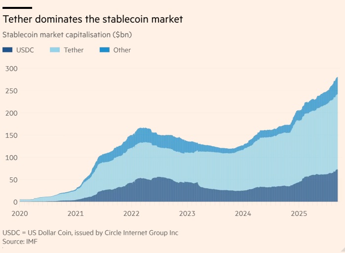 Γενικά, τα stablecoins -περιουσιακά στοιχεία που παρουσιάζονται ως ψηφιακές εναλλακτικές στο fiat χρήμα, ιδιαίτερα τα αμερικανικά δολάρια- φαίνεται να έχουν ένα λαμπρό μέλλον. Ήδη, όπως σημειώνει η Tett, «παίκτες όπως η Standard Chartered προβλέπουν πως ο τομέας των stablecoins θα αναπτυχθεί από τα 280 δισ. δολάρια στα 2 τρισ. δολάρια μέχρι το 2028».