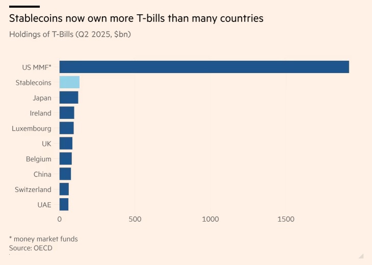 Η Gillian Tett των FT, σε άρθρο της τον περασμένο μήνα, επεσήμανε ένα διαφορετικό κίνητρο για την θετική στάση της κυβέρνησης Τραμπ για τα stablecoins. Ο υπουργός Οικονομικών των ΗΠΑ, Σκοτ Μπέσεντ, έχει ένα πρόβλημα: τον τεράστιο όγκο του χρέους των αμερικανικών treasuries που οι ΗΠΑ χρειάζονται ο κόσμος να διακρατά με μέτρια επιτόκια. Μια λύση, όπως σημειώνει, είναι να προωθήσει την ευρεία χρήση stablecoins σε δολάριο, όχι τόσο εγχώρια, όσο οπουδήποτε αλλού. Αυτό, όπως σημειώνει η Tett, θα ήταν καλό για την αμερικανική κυβέρνηση.