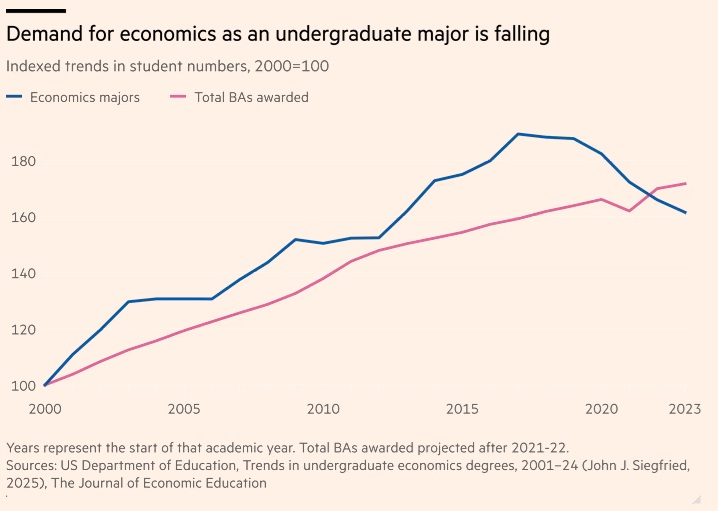 Αυτές οι κάμψεις λειτουργούν σε διαφορετικές χρονικές κλίμακες και τροφοδοτούν η μια την άλλη. Λιγότεροι φοιτητές σημαίνουν λιγότερη ζήτηση για πανεπιστημιακούς διδάσκοντες. Μια εχθρική κυβέρνηση Τραμπ είναι ένας προφανής παράγοντας για τη «βουτιά» 80% στις αγγελίες για θέσεις εργασίας στην ομοσπονδιακή κυβέρνηση μεταξύ του 2019 και του 2025. Και όλα αυτά τα τρία συνιστούν μια άσχημη απειλή για το «εγώ» των οικονομολόγων, που έχει «φουσκώσει» από τα χρόνια της μεγάλης ζήτησης. («Τι εννοείς δεν μας θέλουν; Είμαστε χρήσιμοι!»).