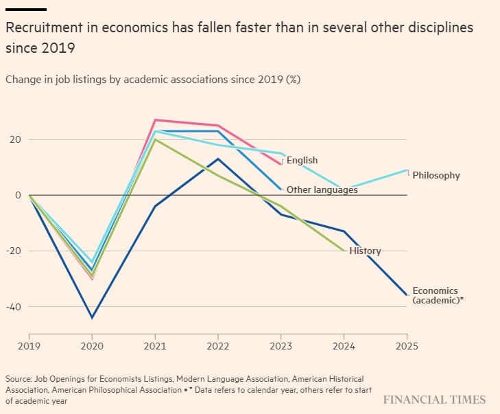 Το πάγωμα προσλήψεων συνέβαλε ώστε να μειωθεί στο μισό ο αριθμός των θέσεων πλήρους απασχόλησης ακαδημαϊκών στις ΗΠΑ από το 2019 μέχρι το 2025. Μόνο τον τελευταίο χρόνο, οι αγγελίες μειώθηκαν περισσότερο απ’ όσο είχαν μειωθεί κατά τη διάρκεια της Μεγάλης Ύφεσης. Και σύμφωνα με τα πιο πρόσφατα συγκρίσιμα δεδομένα, από το 2019 οι προσλήψεις οικονομολόγων έχουν μειωθεί ταχύτερα απ’ ότι αυτές των φιλοσόφων ή των γλωσσολόγων. Ουφ.