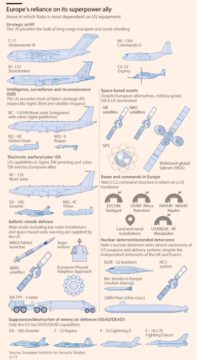 Η συμμαχία εξαρτάται σε πολύ μεγάλο βαθμό από τις ΗΠΑ για κρίσιμης σημασίας δυνατότητες και συγκεκριμένα: πληροφορίες, αναγνώριση και παρακολούθηση· επικοινωνίες μάχης και cloud computing· αεράμυνα· βαρέα μεταγωγικά αεροσκάφη· και αναστολή της εχθρικής αεράμυνας. Τα ευρωπαϊκά μέλη του ΝΑΤΟ στερούνται επίσης πυραύλων ακριβείας μεγάλου βεληνεκούς σε επαρκής ποσότητες.