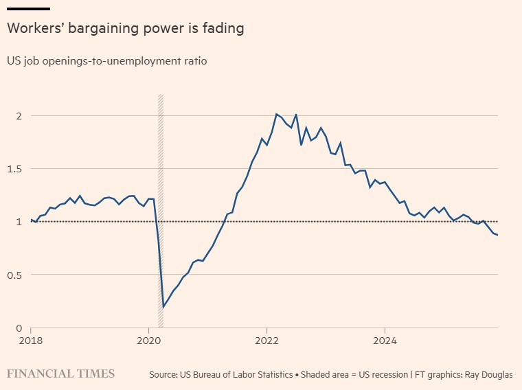 Η αποσύνδεση μεταξύ της επιβράδυνσης της απασχόλησης και της ισχυρής ανάπτυξης του ΑΕΠ στις ΗΠΑ (4,4% στο γ' τρίμηνο) ενδέχεται να είναι πιο ανησυχητική και μακροχρόνια από παλαιότερα επεισόδια. Με καταλύτες την τεχνητή νοημοσύνη, τις διαρθρωτικές αλλαγές μετά την πανδημία και την πολιτική αβεβαιότητα, η αναλογία κενής θέσης/ανεργίας έπεσε κάτω του 1,0, μετατοπίζοντας τη διαπραγματευτική δύναμη προς το κεφάλαιο. Η κατάσταση απειλεί να εντείνει την ανισότητα και να υπονομεύσει την κατανάλωση, θέτοντας σε δίλημμα τη Fed ανάμεσα στη μέγιστη απασχόληση και τη σταθερότητα τιμών. |