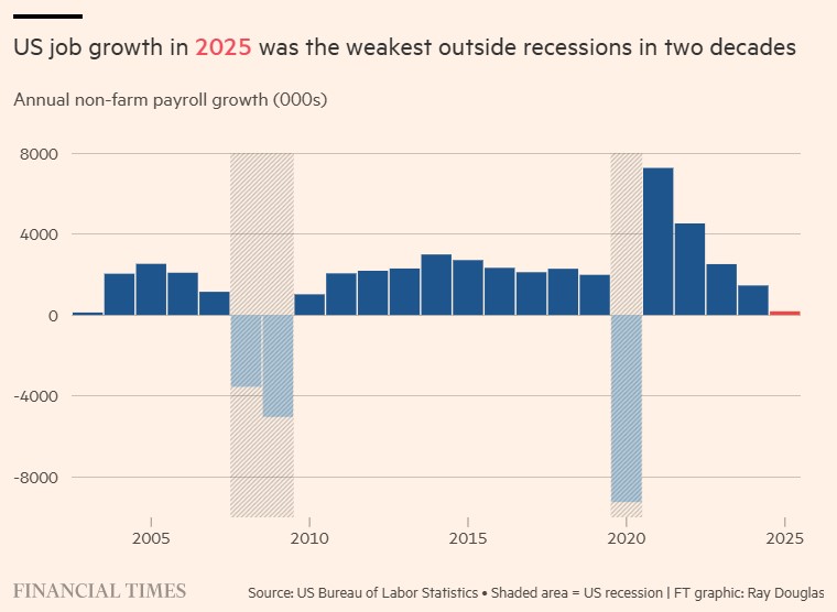 Αλλά τα στοιχεία για τον Δεκέμβριο και τον Νοέμβριο αναθεωρήθηκαν προς τα κάτω σε 48.000 και 41.000 αντίστοιχα. Το σημαντικότερο είναι πως οι ακόμα μεγαλύτερες αναθεωρήσεις για το 2025 συνολικά είχαν ως αποτέλεσμα την ισχνότερη χρονιά δημιουργίας θέσεων εργασίας πέραν των υφέσεων των τελευταίων δυο δεκαετιών.