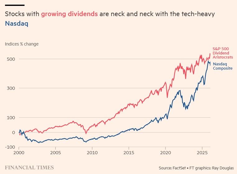 Σε αντίθεση με ό,τι πιστεύουν οι θιασώτες των μετοχών ανάπτυξης, η συνολική απόδοση του S&P Dividend Aristocrat Index τα τελευταία 25 χρόνια είναι σχεδόν ισόπαλη με εκείνη του τεχνολογικού Nasdaq, αλλά με αισθητά χαμηλότερη μεταβλητότητα.