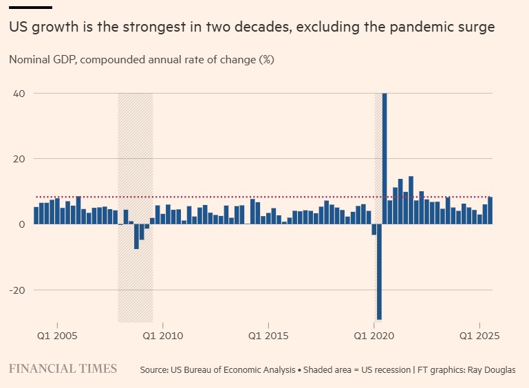Η αμερικανική οικονομία είναι αυτή τη στιγμή αρκετά ισχυρή. Το ονομαστικό ΑΕΠ το τελευταίο ανακοινωμένο τρίμηνο ήταν πάνω από 8%, που είναι η ισχυρότερη ανάπτυξη των τελευταίων 20 ετών πέραν της μεταπανδημικής περιόδου. Αυτό εξαιρεί τις προσαρμογές για τον πληθωρισμό στα συνολικά στοιχεία για την οικονομική ανάπτυξη.