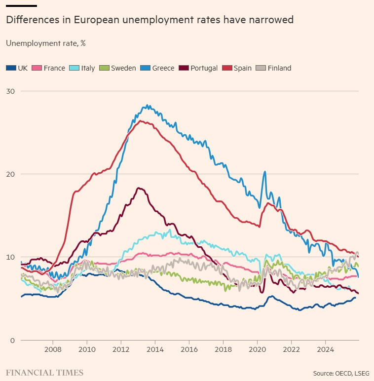Στο αποκορύφωμα της κρίσης, η Ισπανία και η Ελλάδα είχαν ποσοστά ανεργίας άνω του 25%. Αυτά έχουν πλέον μειωθεί κατά περισσότερο από το ήμισυ. Η Φινλανδία, που συνήθως σχετίζεται με τα χαμηλότερα σκανδιναβικά επίπεδα ανεργίας, τώρα έχει τον υψηλότερο ρυθμό ανεργίας στην ΕΕ. Και καθώς οι χώρες της βόρειας Ευρώπης δυσκολεύονται με τις ελλείψεις εξειδικευμένου προσωπικού, η Ισπανία και η Ιταλία έχουν εφαρμόσει μέτρα για την προσέλκυση ξένων εργατών.