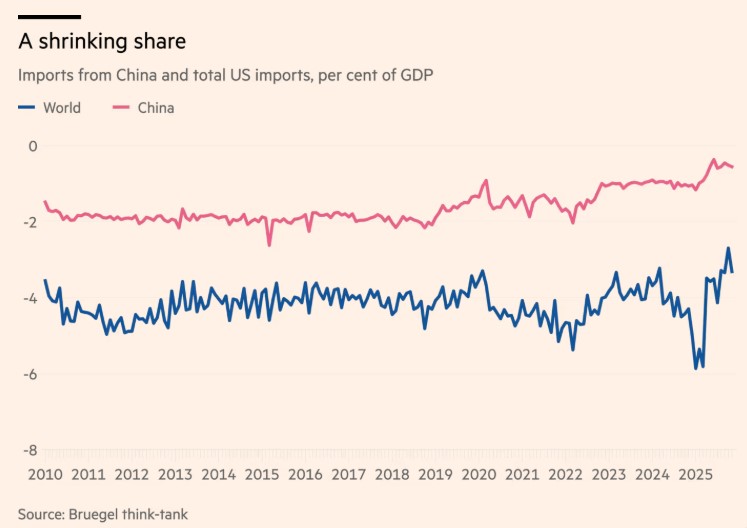 Με το να αυξήσει απότομα τους δασμούς, ο Τραμπ έχει ήδη δοκιμάσει και αποτύχει να επιβραδύνει την υπερανταγωνιστική μηχανή εξαγωγών της Κίνας. Οι κινεζικές εξαγωγές προς τις ΗΠΑ μειώθηκαν κατά περίπου ένα τρίτο το 2025, αλλά η τεράστια αύξηση του εξοπλισμού ΙΤ που σχετίζεται με την τεχνητή νοημοσύνη έχει τονώσει τις πωλήσεις προς τρίτες χώρες.