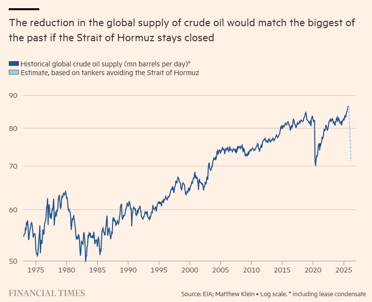 Μεγάλο μέρος αυτού έχει πλέον εξαφανιστεί. Αν η κίνηση μέσω των Στενών παραμείνει μπλοκαρισμένη επειδή τα πλοία επιλέγουν να αποφύγουν τους πυραύλους, τα drones και τις νάρκες του Ιράν, η απώλεια στην παγκόσμια προμήθεια θα είναι πρωτοφανής.