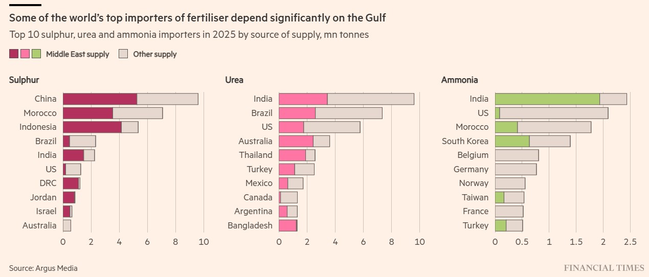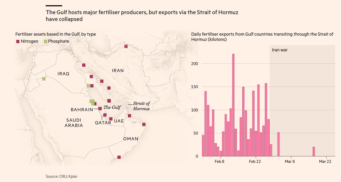 Ο Περσικός Κόλπος βρίσκεται στην καρδιά των παγκόσμιων αγορών λιπασμάτων. Η παραγωγή του έχει σταματήσει και οι αποστολές εμπορευμάτων έχουν διακοπεί, εμποδίζοντας τις προμήθειες και αυξάνοντας τις παγκόσμιες τιμές.