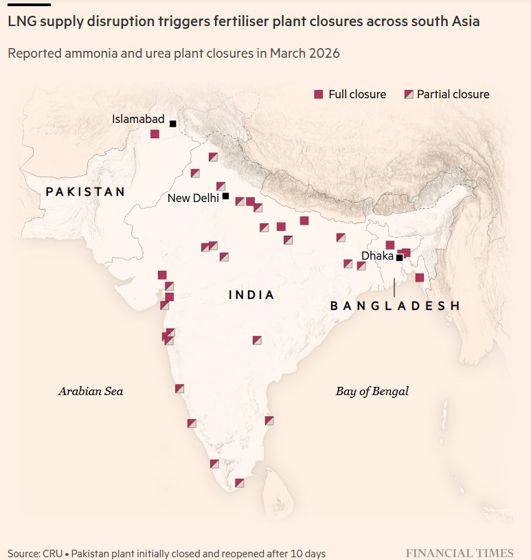 Χώρες στη νότια Ασία που βασίζονται στο LNG από τον Περσικό Κόλπο επωμίζονται το μεγαλύτερο βάρος. Ενώ η Ινδία, ένας από τους μεγαλύτερους καταναλωτές λιπάσματος στον κόσμο, εισάγει σχεδόν το ένα τρίτο των προμηθειών της και εξαρτάται σε μεγάλο βαθμό από τον Περσικό Κόλπο, η εγχώρια παραγωγή της εξαρτάται από το εισαγόμενο LNG, το 40% περίπου του οποίου προέρχεται από το Κατάρ. Άλλα βασικά στοιχεία όπως τα φωσφορικά άλατα, η ποτάσσα και το θείο, επίσης προέρχονται σε μεγάλο βαθμό από το εξωτερικό.