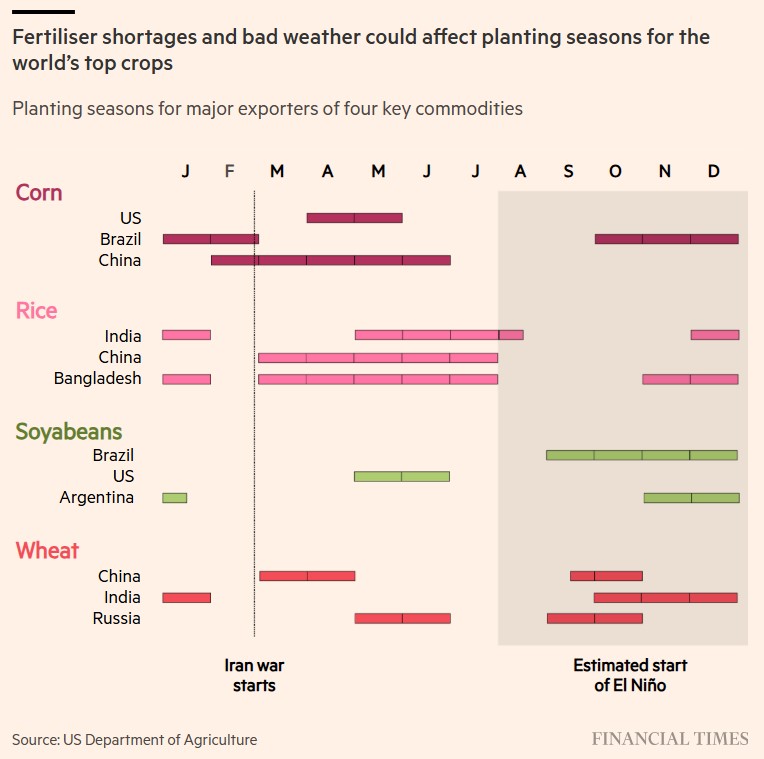 Στη συνέχεια, οι κίνδυνοι γίνονται ακόμα εντονότεροι. Στις χώρες της νότιας Ασίας όπως το Μπαγκλαντές, το Πακιστάν, η Σρι Λάνκα και η Ινδία, η κύρια εποχή σποράς ξεκινά με την έλευση των τυφώνων τον Ιούνιο –μια από τις περιόδους με την υψηλότερη χρήση λιπασμάτων στην παγκόσμια γεωργία, η οποία εξαρτάται σε μεγάλο βαθμό από εισαγωγές από τον Περσικό Κόλπο.