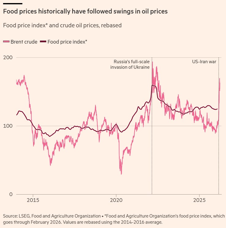 Οι διαταράξεις ήδη έχουν επίπτωση. Σε όλη την Ασία και την Αφρική, οι αυξήσεις στα κόστη καυσίμων έχουν ωθήσει υψηλότερα τις τιμές των τροφίμων. Αφρικανικές χώρες όπως η Κένυα, η Σομαλία, η Τανζανία και το Σουδάν, που εξαρτώνται ιδιαιτέρως από τα λιπάσματα που μεταφέρονται δια θαλάσσης, ήδη υποφέρουν. Στη Σομαλία, οι τιμές των βασικών τροφίμων έχουν αυξηθεί κατά περίπου ένα πέμπτο από τότε που ξεκίνησε ο πόλεμος, σύμφωνα με το Παγκόσμιο Επισιτιστικό Πρόγραμμα του ΟΗΕ.