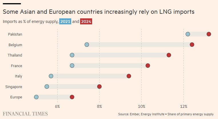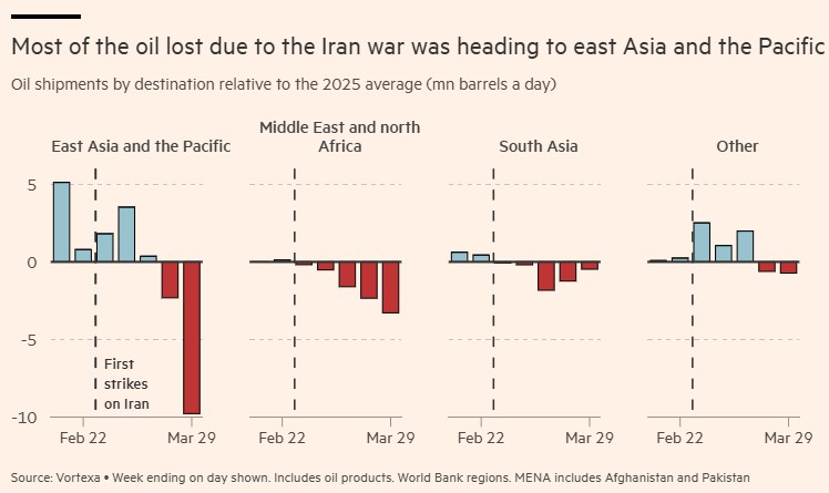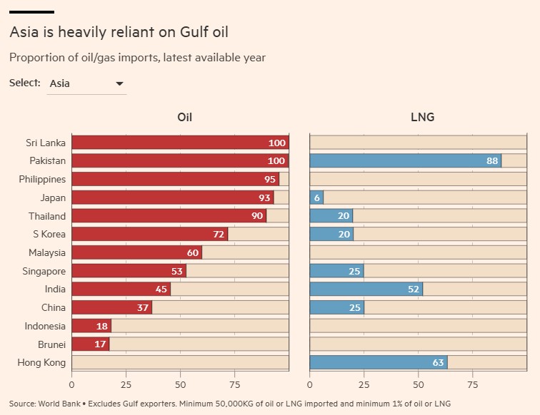 Οι ασιατικές οικονομίες βρίσκονται στην πρώτη γραμμή της κρίσης. Σύμφωνα με την Αμερικανική Υπηρεσία Ενεργειακής Πληροφόρησης, το 83% του υγροποιημένου φυσικού αερίου και το 84% του αργού πετρελαίου που διακινήθηκε μέσω των Στενών του Ορμούζ το 2024 είχαν προορισμό την Ασία.
