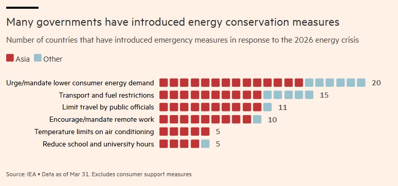 Οι Φιλιππίνες δεν είναι οι μόνες που εισάγουν μέτρα συντήρησης των καυσίμων. Η Ταϊλάνδη ενθαρρύνει την τηλεργασία για τους δημόσιους υπαλλήλους και ζητά από τους κατοίκους να μειώσουν τη χρήση των κλιματιστικών. Το Βιετνάμ προωθεί την ποδηλασία και τον συνεπιβατισμό (carpooling).