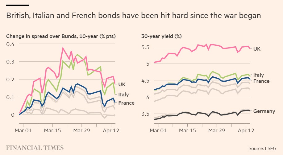 Καν’ τε στην άκρη Piigs. Τα σημερινά προβληματικά παιδιά των ευρωπαϊκών αγορών χρέους, σύμφωνα με τους επενδυτές, είναι πλέον τα «Bifs»: η Βρετανία, η Ιταλία και η Γαλλία (Britain, Italy, France). Οι τρεις οικονομίες υπέστησαν τις μεγαλύτερες αυξήσεις στα κόστη δανεισμού μεταξύ των μεγάλων αγορών ευρωπαϊκών ομολόγων μετά το ξέσπασμα του πολέμου στη Μέση Ανατολή στις 28 Φεβρουαρίου.