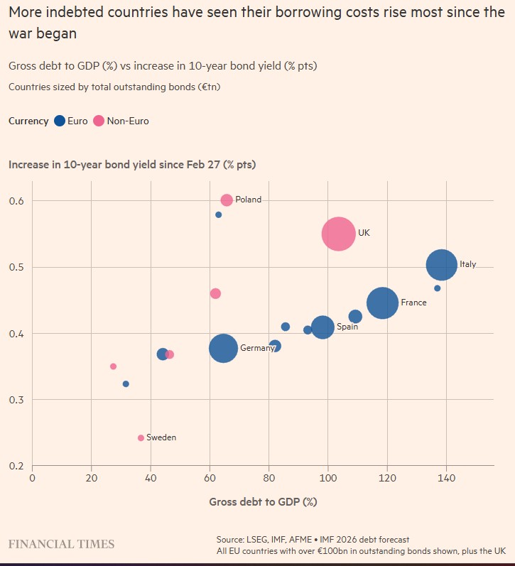 Η Ευρώπη, ως η μεγαλύτερη παγκοσμίως αναπτυγμένη αγορά εισαγωγής ενέργειας, θεωρείται ευρύτερα πως είναι ιδιαίτερα ευάλωτη στην επίπτωση του πολέμου του Ιράν, με τις πιθανές επιπλέον δαπάνες να προστίθενται στις τεράστιες εκδόσεις χρέους ως αποτέλεσμα της πανδημίας του κορωνοϊού που είχαν ήδη οδηγήσει υψηλότερα τα μακροπρόθεσμα κόστη δανεισμού των χωρών.