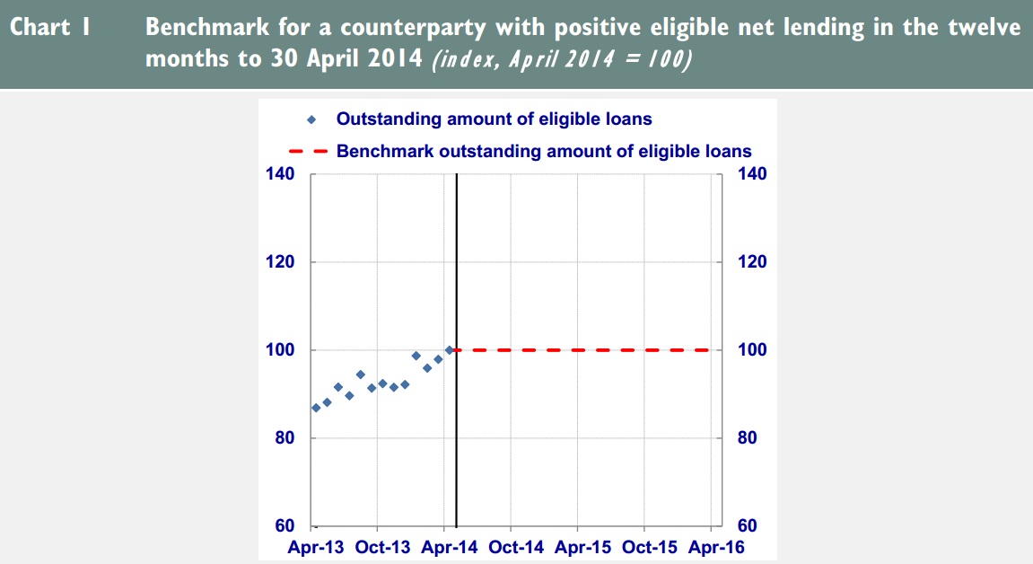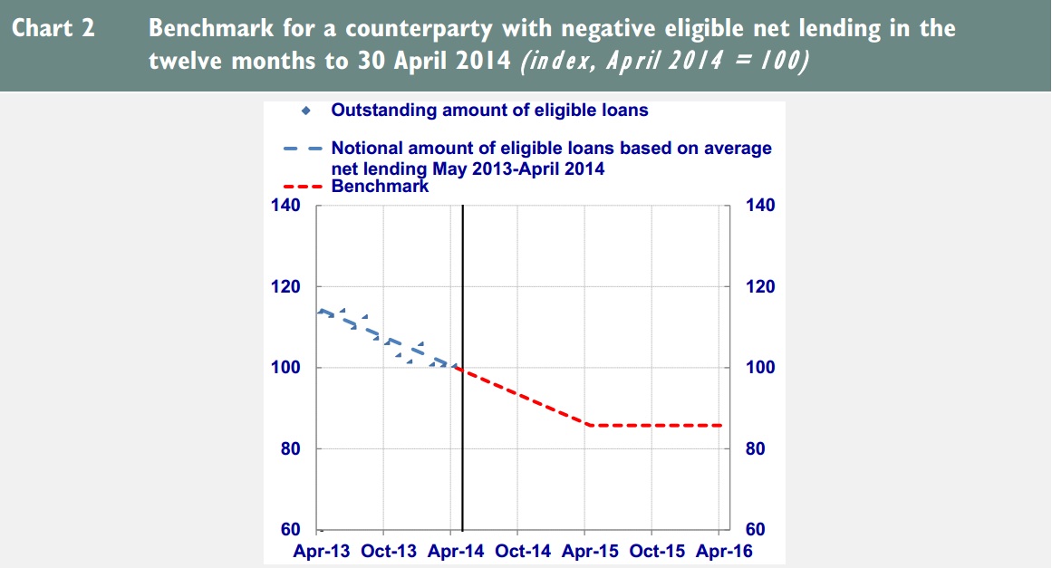 Εάν οι τράπεζες ξεπεράσουν τον στόχο, τότε μπορούν να διεκδικήσουν τριπλάσιο δανεισμό έναντι του δείκτη αναφοράς στις έξι δημοπρασίες που θα διεξαχθούν το 2015 και το 2016. Έτσι, οι τράπεζες θα μπορούσαν συνολικά να δανειστούν επιπλέον 600 δισ. ευρώ.