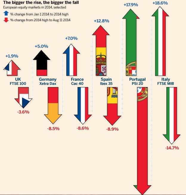 Ο δείκτης FTSEurofirst 300 έχει διολισθήσει 5,5% από τις 3 Ιουλίου (την ίδια περίοδο ο αμερικανικός S&P 500 υποχώρησε 2,5%). Ο γερμανικός Dax είχε υποχωρήσει πάνω από 10% -ποσοστό που αποτελεί τον επίσημο ορισμό διόρθωσης στην αγορά- πριν ανακάμψει λίγο αυτήν την εβδομάδα (σε αντίθεση με άλλους δείκτες, ο Dax περιλαμβάνει τις μερισματικές αποδόσεις). Ο PSI 20 της Πορτογαλίας έχει υποχωρήσει φέτος περισσότερο από τον ρωσικό Micex.