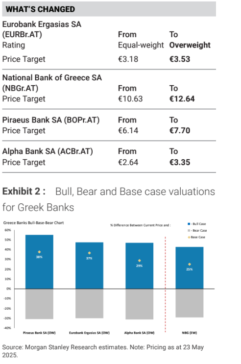 Η επενδυτική τράπεζα προχώρησε σε αύξηση των τιμών-στόχων για όλες τις ελληνικές τράπεζες, ενώ αναβάθμισε τη σύσταση για τη μετοχή της Eurobank σε Overweight από Equal-weight, βλέποντας πλέον πιο ελκυστικό προφίλ ρίσκου-απόδοσης.