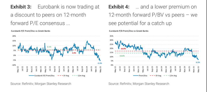 Η Morgan Stanley εκτιμά ότι η σύγκλιση των αποτιμήσεων μεταξύ ελληνικών και ευρωπαϊκών τραπεζών είναι δικαιολογημένη, λόγω της αναβάθμισης του μακροοικονομικού περιβάλλοντος στην Ελλάδα και της συνεχιζόμενης βελτίωσης των θεμελιωδών μεγεθών των τραπεζών.