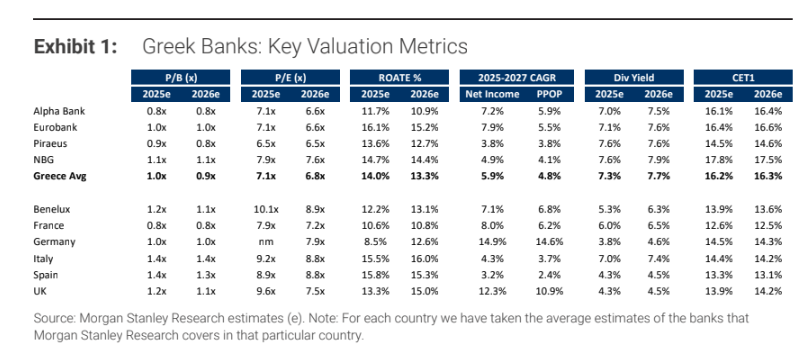 Παρά την ισχυρή άνοδο των μετοχών τους κατά 38% από τις αρχές του έτους, οι ελληνικές τράπεζες παραμένουν ελκυστικές, σύμφωνα με τη Morgan Stanley, η οποία διατηρεί τη θετική της στάση για τον κλάδο. Με εκτιμώμενο δείκτη τιμής προς κέρδη (P/E) στο 6,8x και τιμής προς λογιστική αξία (P/BV) στο 0,9x για το 2026, εξακολουθούν να τελούν υπό διαπραγμάτευση με σημαντικό discount έναντι των ευρωπαϊκών ομολόγων τους.