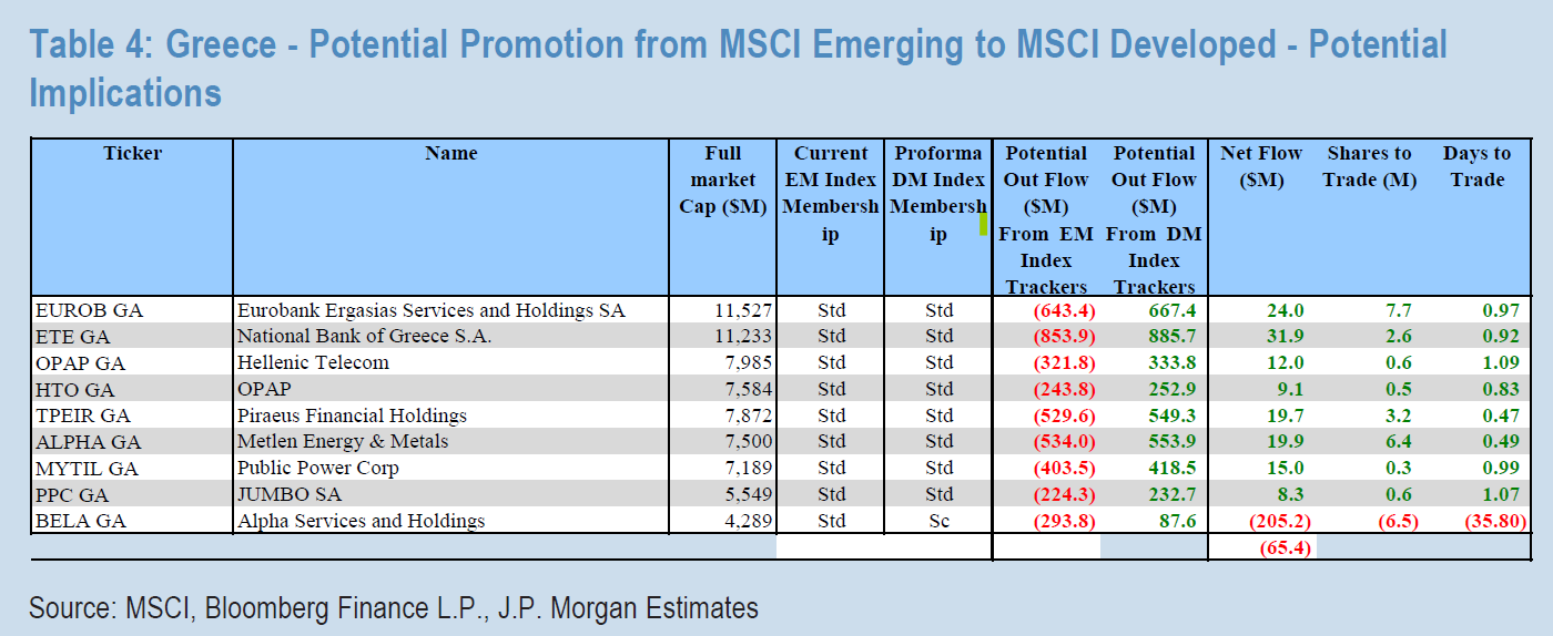 Η αναβάθμιση της Ελλάδας από την MSCI σε ανεπτυγμένη αγορά ενδέχεται να έχει θεσμικό κύρος, αλλά, κατά την JP Morgan θα έχει λειτουργικά αρνητική επίδραση στη δυναμική της αγοράς μετοχών με μείωση της κάλυψης των αναλυτών (analyst coverage), λιγότερες αναλύσεις από ξένους οίκους. Απουσία θεματικής παρουσίας στα μεγάλα funds και μετατροπή της ελληνικής αγοράς από «διακριτό προορισμό» σε «περιθωριακή επιλογή». Η συμβουλή που πλανάται μεταξύ των γραμμών της έκθεσης είναι ξεκάθαρη: «Don’t let a bad idea ruin a good stock market».